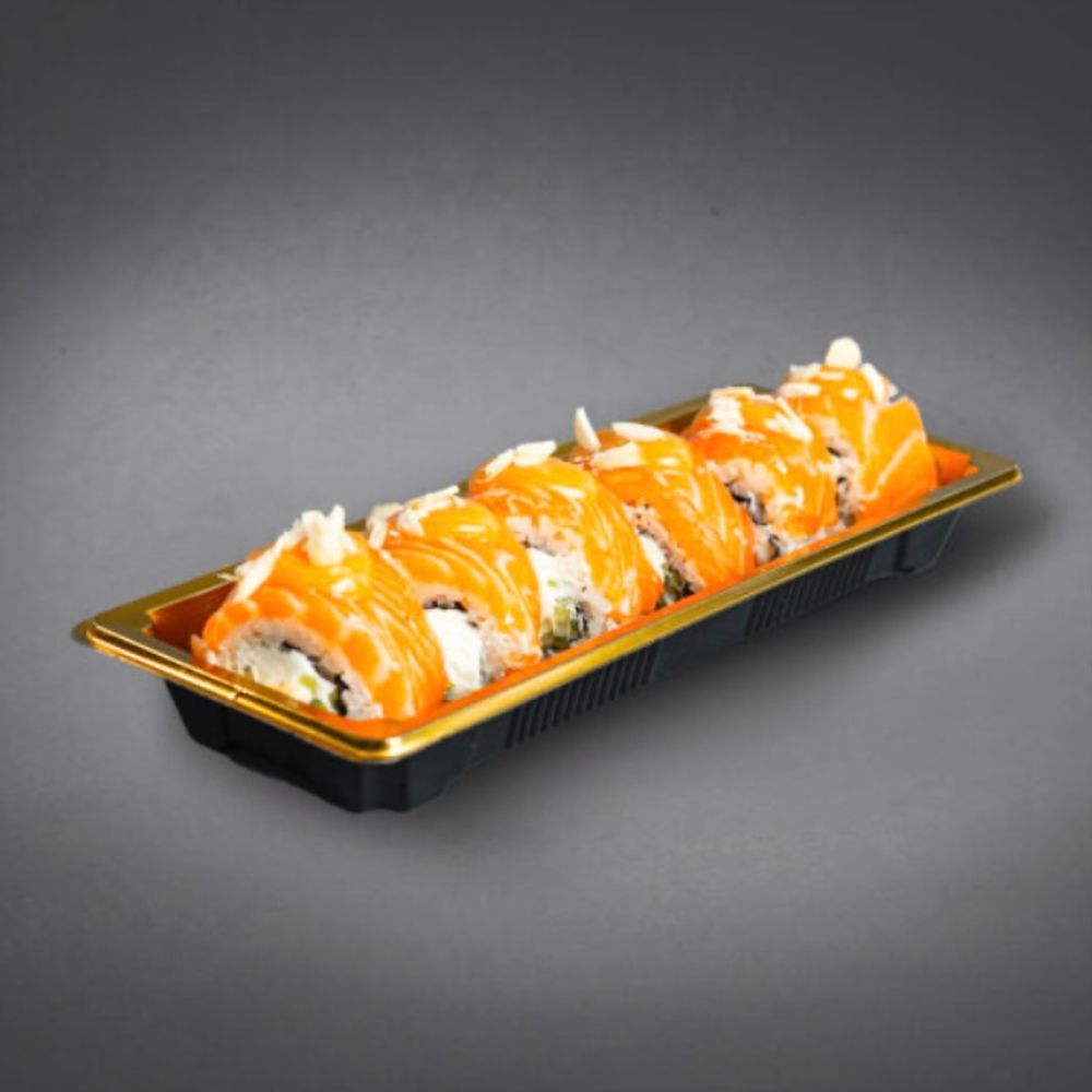 Нори, рис, лосось, карамель, сыр, миндаль, огурцы