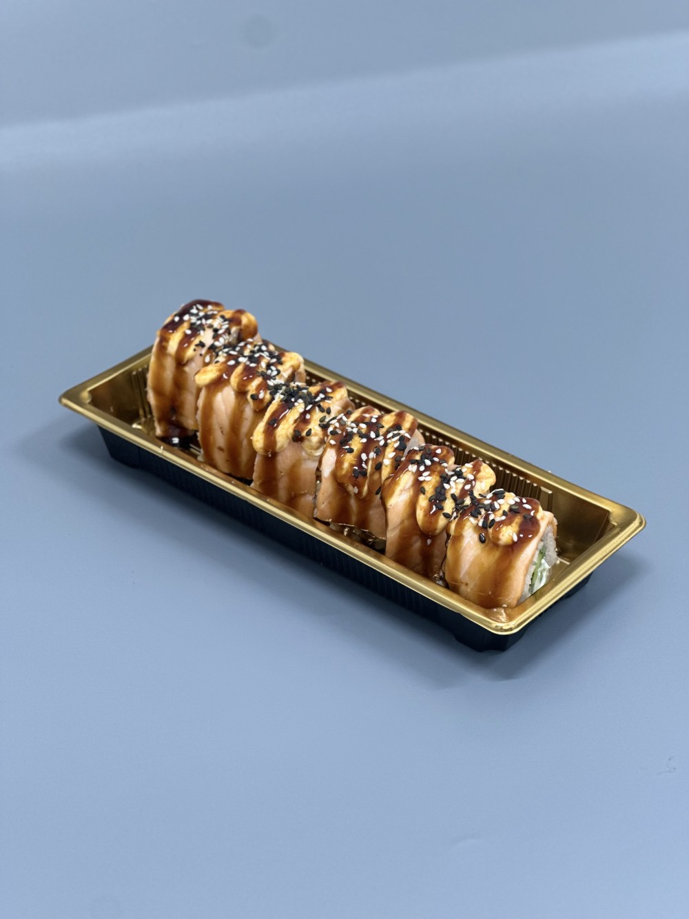 Лосось опаленный, сыр, огурцы, нори, рис, соус спайси с добавлением икры тобико, унаги, кунжут
