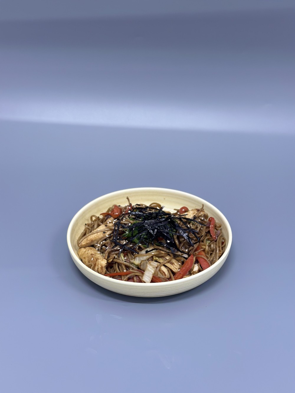 Лапша гречневая, мясо курицы, болгарский перец, пекинская капуста, лук, зеленый лук