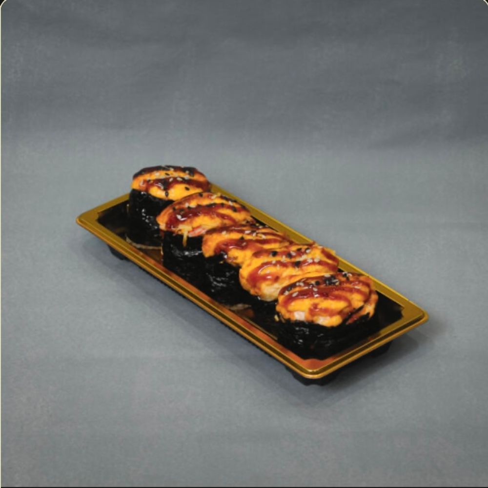 Гункан угорь, гункан лосось, гункан креветка, гункан краб, гункан тунец все под запеченным соусом