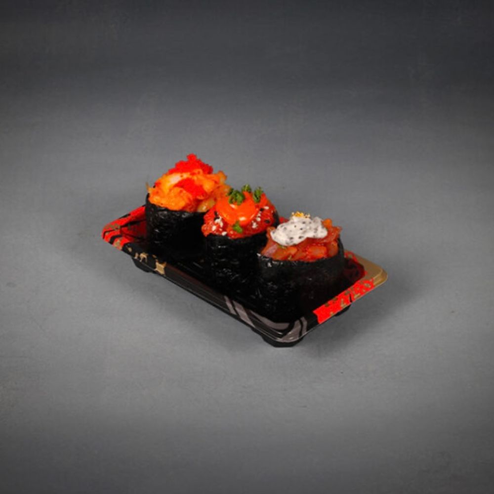 Гункан креветка, Гункан лосось спайси, Гункан с тунцом и трюфельной пастой - 3 шт