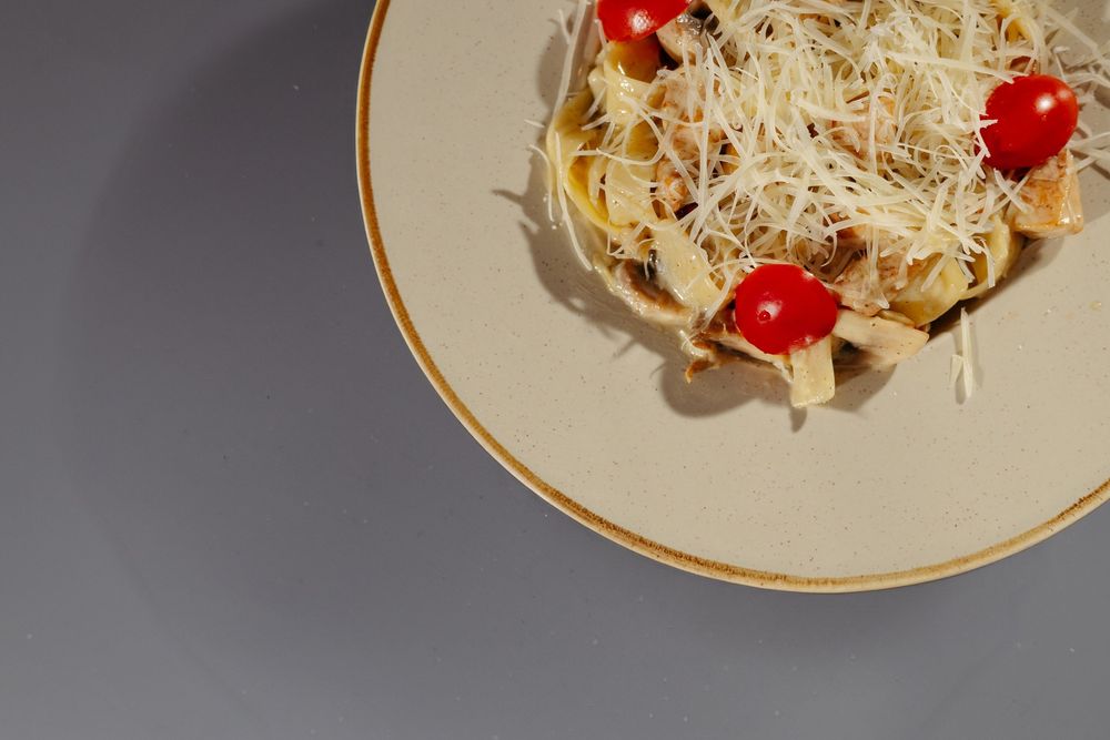 Куриное филе, фетучини, шампиньоны, помидоры черри, пармезан