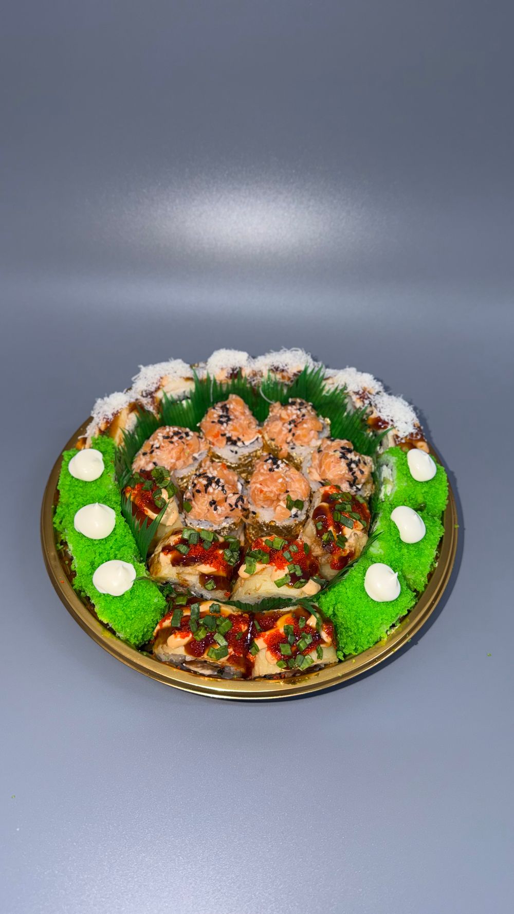 Калифорния с крабом, Двойной лосось в золоте, Креветки темпура с угрем, Темпура микс