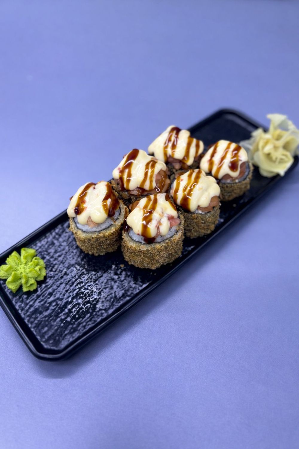 Хрустящий темпура -ролл с японским омлетом тамаго и сливочным сыром. ( нори, рис, сыр, тамаго, лосось, сливочный соус)