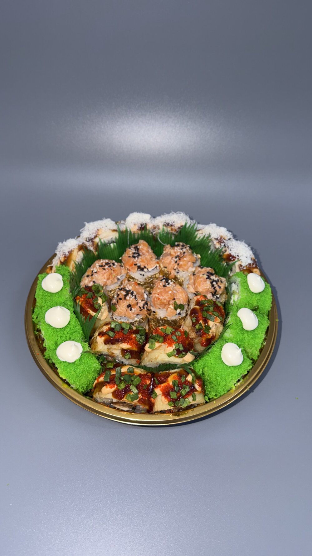 Калифорния с крабом, Двойной лосось в золоте, Креветки темпура с угрем, Темпура микс